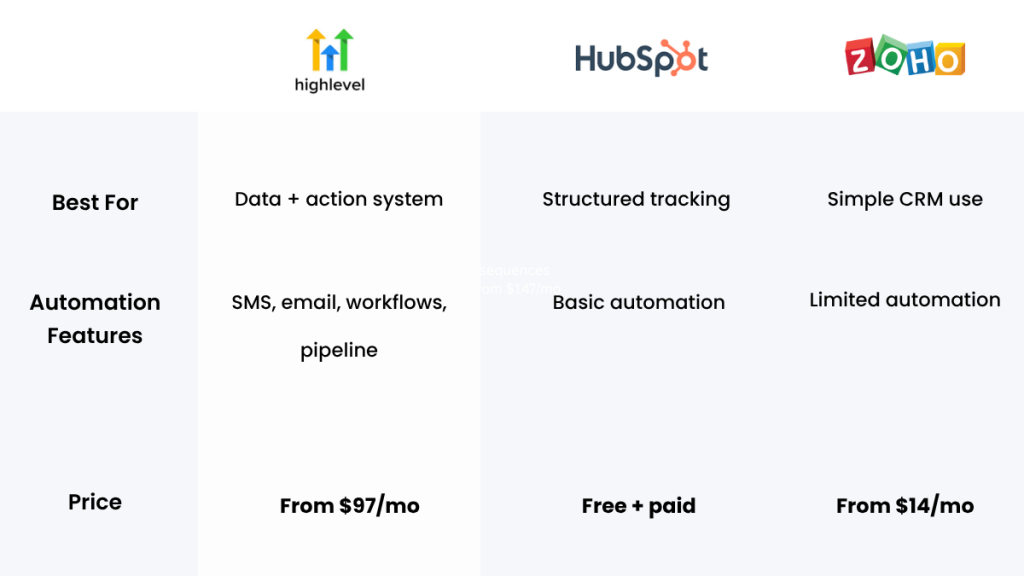 GoHighLevel is one of the strongest options if you want automation and conversions. HubSpot and Zoho are useful for tracking but rely more on manual effort.