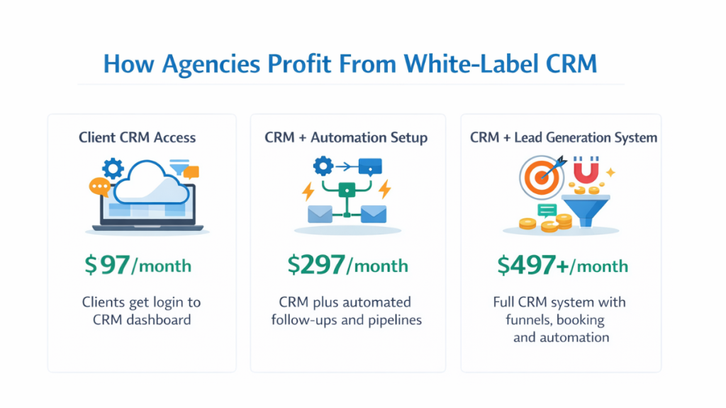 Agencies often combine CRM access with marketing services to create recurring monthly revenue.