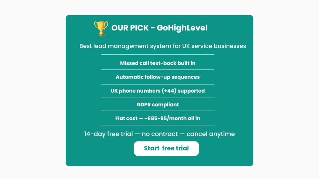How to stop missing calls as a plumber UK — where do I start? Start with GoHighLevel’s 14-day free trial. The missed call text-back takes about 10 minutes to set up and starts recovering leads the same day. See our GoHighLevel for Plumbers UK guide → for the full setup walkthrough.