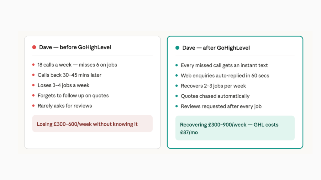 He recovers 2–3 jobs a week he was previously losing. At an average job value of £150–300, that’s £300–900/week recovered. GoHighLevel costs him £87/month.