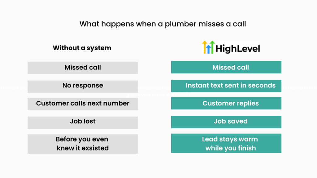 How to stop missing calls as a plumber UK — where do I start? The most effective fix is a missed call text-back system — an automatic SMS sent within seconds of a missed call that keeps the lead engaged while you finish your current job. GoHighLevel handles this automatically for UK plumbers. See our GoHighLevel for Plumbers UK guide → for the full setup walkthrough.