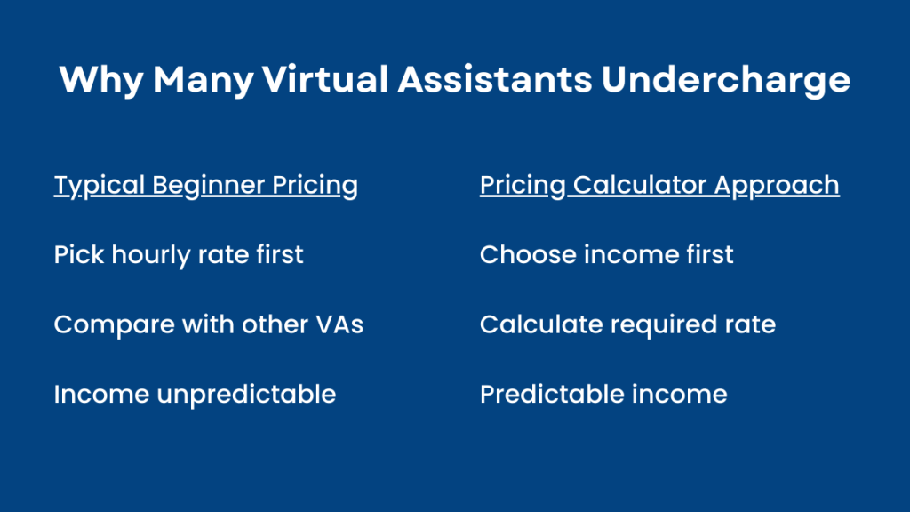 Experienced virtual assistants usually approach pricing differently. They decide what monthly income they want first, then calculate the rates required to reach it.